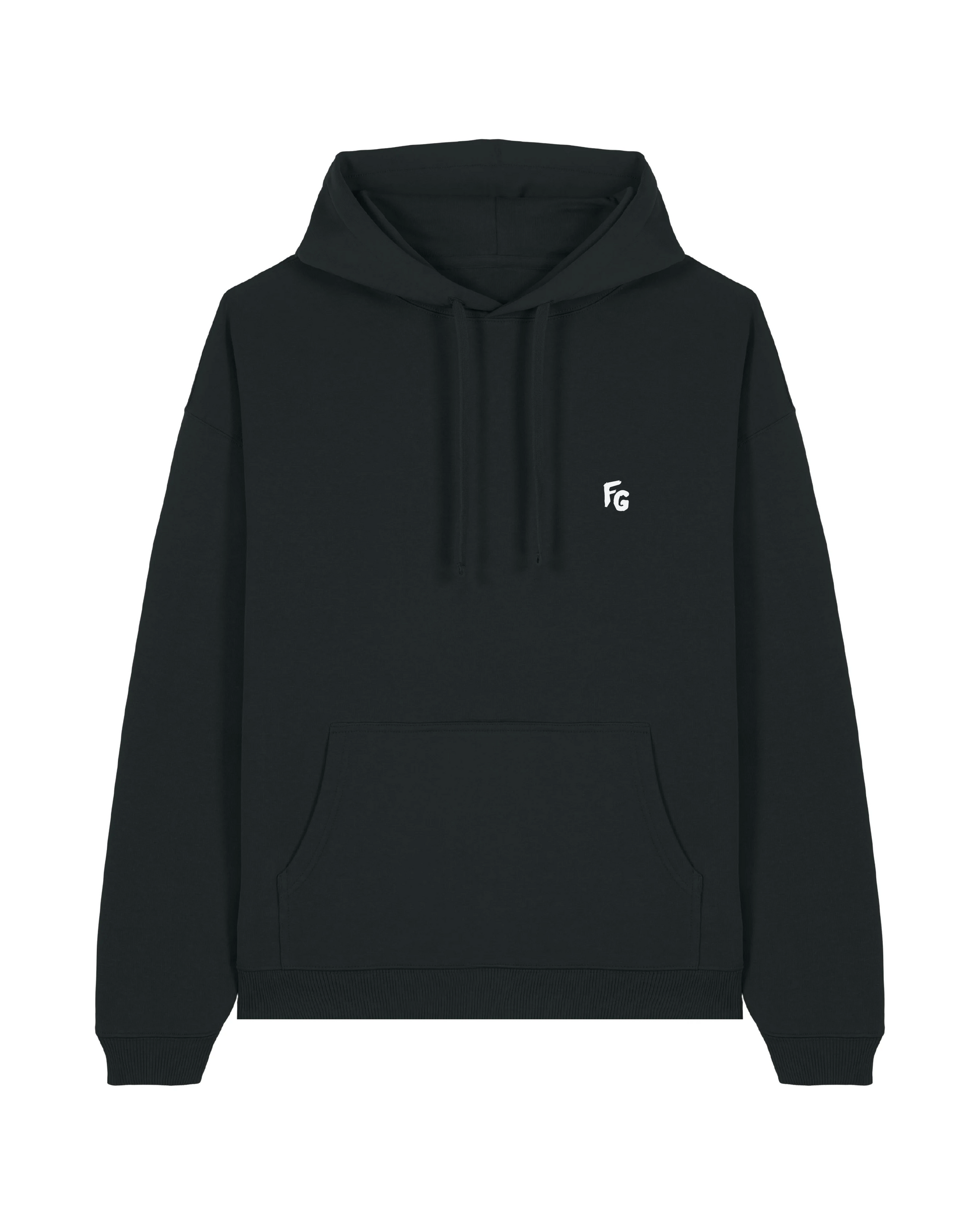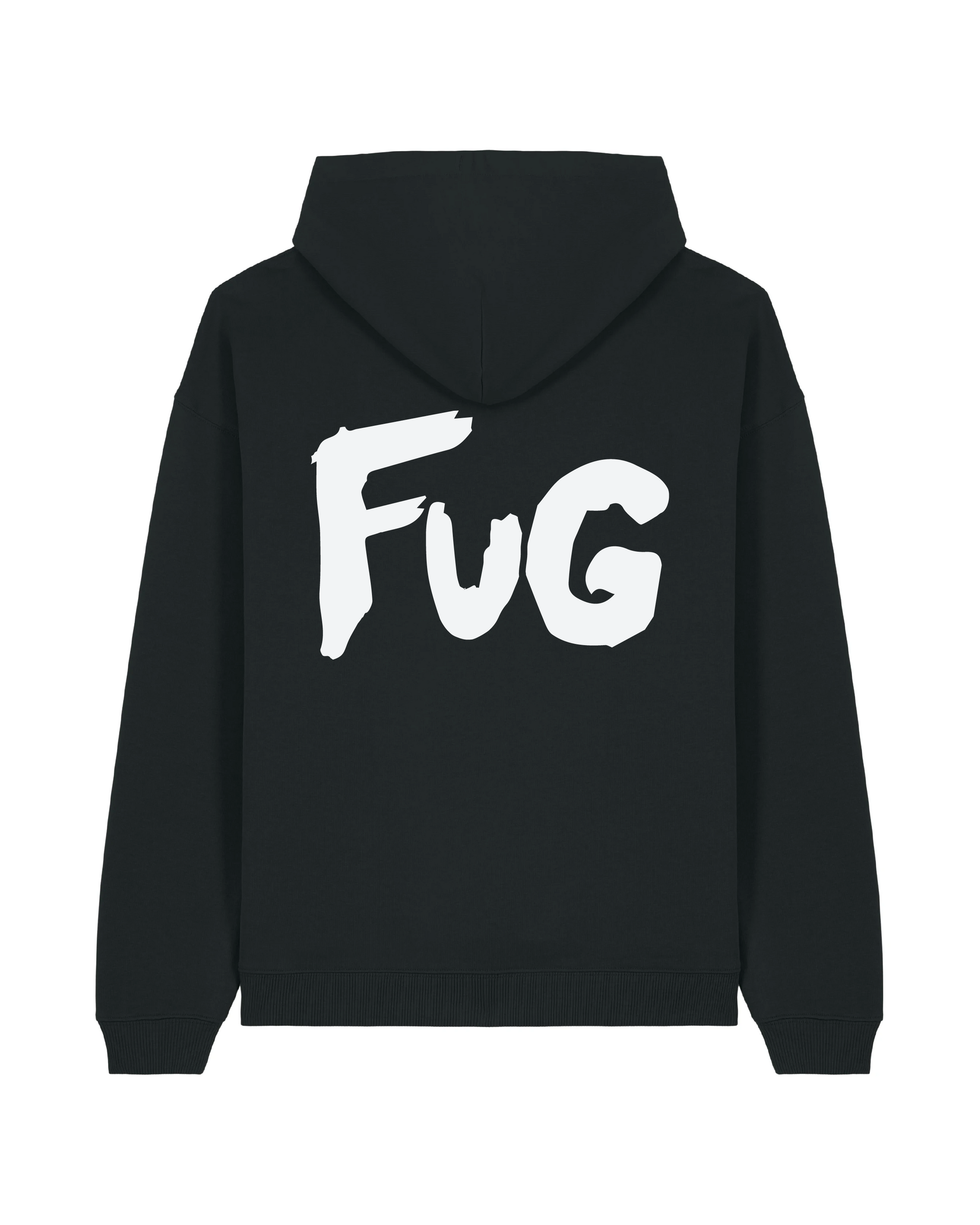 Hooded sweater, cut to a slightly oversized unisex fit. FuG signature artwork on back and FG on front screenprinted using water based ink. This hoodie is made of 400 GMS organic cotton.
