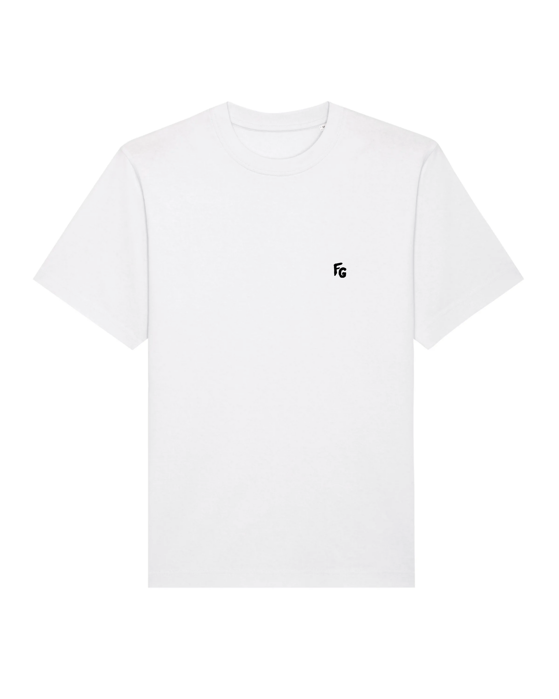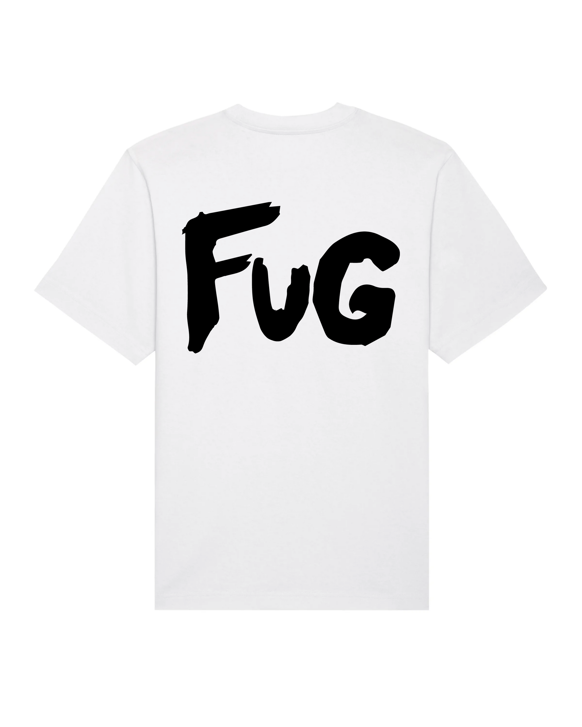 Crew neck t-shirt, cut to a relaxed unisex fit. FuG signature artwork on back and FG on front screenprinted using water based ink. This tee is made out of 215 GSM organic cotton.